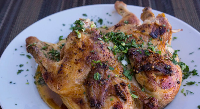 트케말리의 훌륭한 동반자는 치킨 타바카다. '타바카(табака)'라는 이름은 '무거운 프라이팬(сковорода)'을 뜻하는 조지아 어 '타파(тафа)'에서 온 것으로 반을 갈라 또 다른 프라이팬과 무거운 물건으로 눌러 납작하게 만든 닭고기를 프라이팬으로 요리하는 것을 가리킨다. 이 다용도 음식은 주말 점심이나 일요일 밤 야식으로 제격이다. 만들기 쉬워 내가 크기가 작은 닭이나 영계를 요리할 때 애용하는 조리법이다. 이 요리는 닭을 이등분해서 파는 경우가 많은 러시아에서 인기가 매우 높다. 날개를 접어 가슴 속으로 넣는 복잡한 방법도 몇 가지 있지만 전혀 신경 쓸 필요 없다. 그저 가슴뼈를 반으로 갈라놓기만 하면 반은 된 것이다.